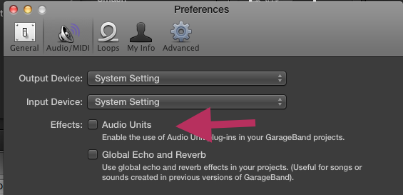 By default, the Audio Units area is not visible in the Smart Control inspector. When you open a song that uses Audio Units, the Audio Units area is available in the Smart Controls pane, if Audio Units plug-ins are installed on your computer. You can change the Use Audio Units preference in the Audio/MIDI pane of GarageBand preferences. For more information, see Audio/MIDI preferences.