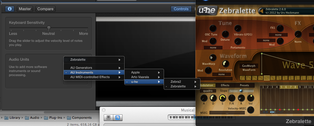 For example, to play the Zebralette instrument: Click the upper brick in the right column of the Audio Units brick (the lower will add effects, not instruments).