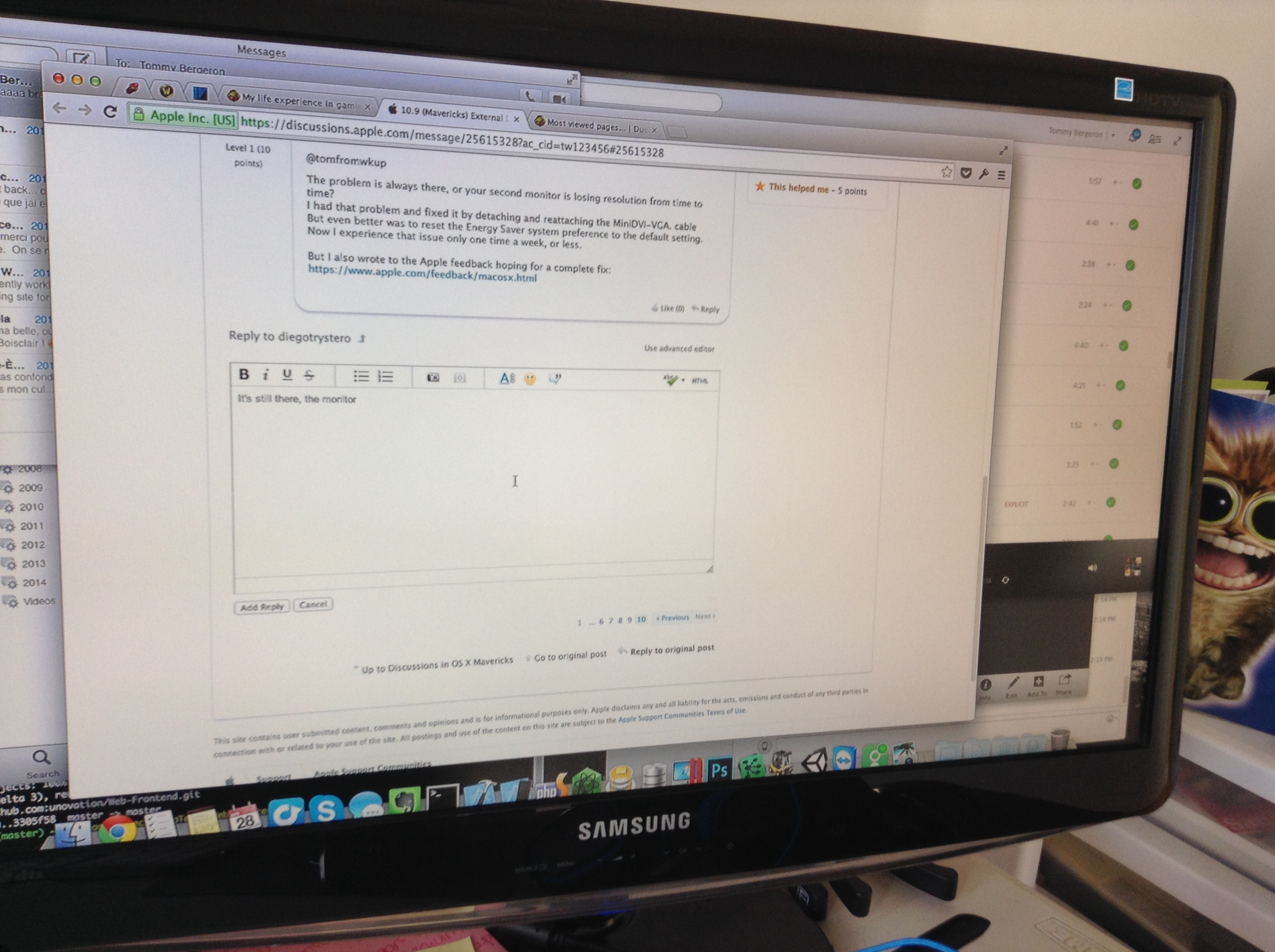 I have a mid 2012 MACBOOK Pro 15 inch with KOGAN 2560x1440 external monitor connected to display port on mac. Things worked fine until my first install of Mavericks - which started to create Mosaic patterns on my screen. Updating to Mavericks 10.9.2 caused the system to crash frequently after hibernation and at this point I lost my Hi_res display output. This monitor uses a separate input for this resolutionand a separate input for the 1920x1080p output - which still works fine (but now I have the same lo-resolution 1080p res i was trying to avoid by buying this monitor).