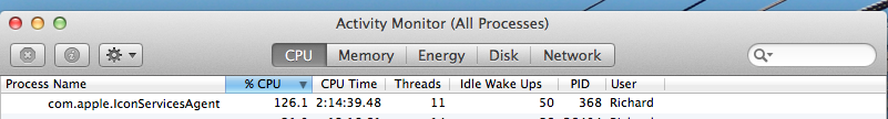 I updated my MacBook Pro to OS X 10.9.3 at the weekend. Today afternoon I noticed that the IconServicesAgent used nearly all of the CPU.