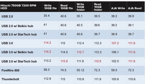 Speed chart USB2, USB3, FW, Thunderbolt with conventional 7200RPM HD. All speeds are ultimately limited by platter and spindle speed and start-up revs.