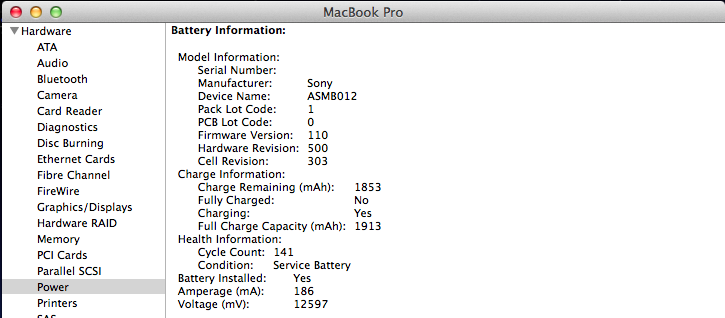 This time, when the battery was fully charged it did go up to 100%, however some time later I noticed the “Service Battery” alert. There was no progression from normal status to “Replace Soon” to “Replace Now” to “Service Battery”.