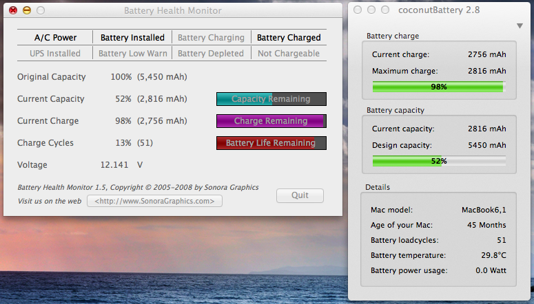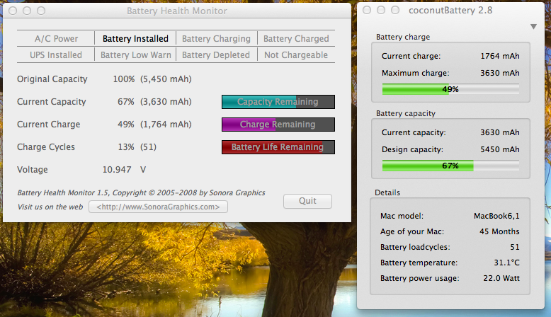 Interesting. erickpere2, do you see the capacity go up when running on AC? I ask because I took my MBP off AC power, and over the past couple of hours, I've seen the max capacity slowly creep up, according to coconutBattery. It was originally 4123 mAh (76%) and now it's at 4190 mAh (77%).