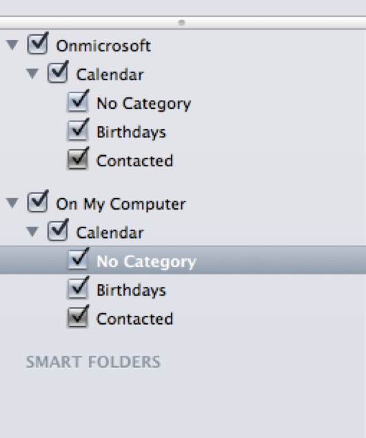 5. Under Calender, Contacts, Tasks and Notes in Outlook 2011, there appeared the OnMicrosoft heading in addition to the On My Computer heading. The Calender, Contacts, Tasks and Notes folders under the On My Computer Heading were duplicated under the OnMicrosoft heading. These headings also showed up on my iPhone. Nevertheless, these new folders were blank, i.e. they contained no information.