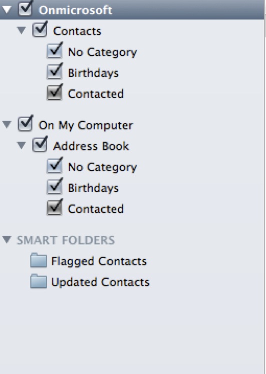 2. When used the Sync Services to sync my Outlook 2011 Contacts and Calendars in OnMicrosoft (Exchange), it duplicated all information exactly from On My Computer. I checked the contents of OnMicrosoft and On My Computer Contacts and Calendars and they match exactly. See the following images. I am still stumped.