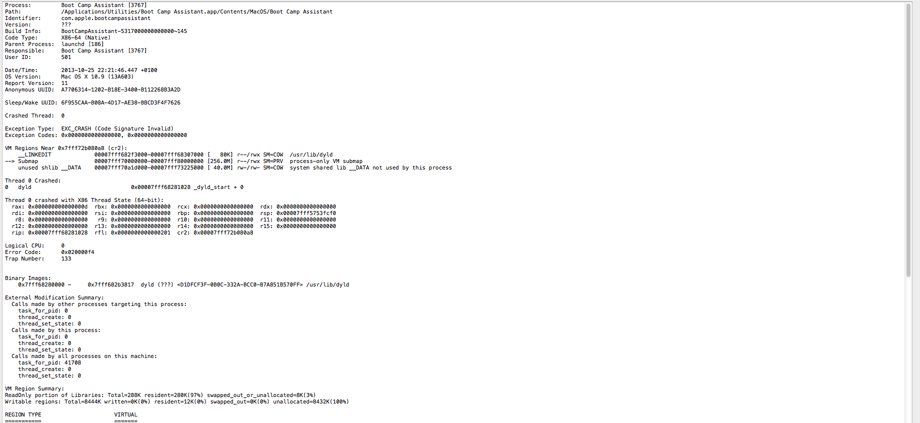 Hopefully those are big enough to read. Basically, after following the original steps in this discussion, it has stopped my ability to open Bootcamp. I think it's a problem with my info.plist, even though its the same one that came with my mac. I think that command has caused more problems than good.