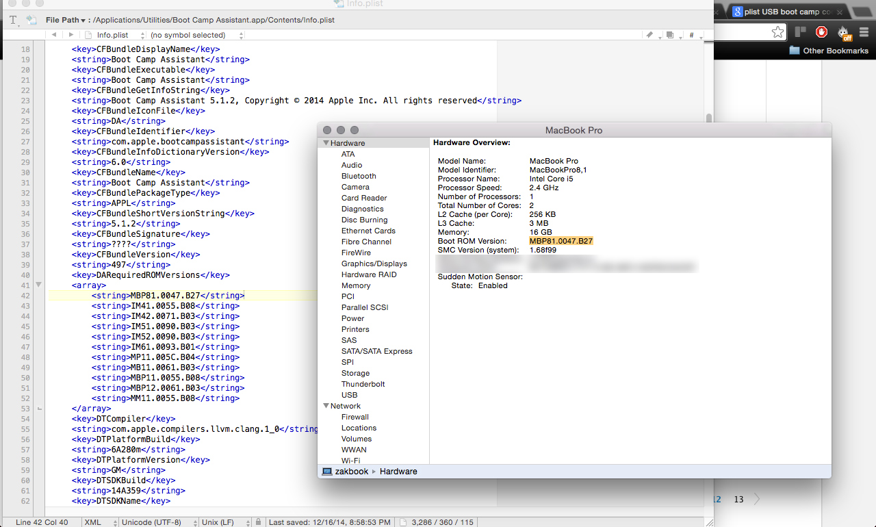 i got rid of the pre and under array i added <string>MacBookPro8,1</string> make sure it looks the same as the rest with the coma etc don't do it like this <string>MBP81</string> this wouldn't work for me once its done save it then insert it into the contents folder authenticate it etc go into terminal and make sure you type sudo codesign -fs - /Applications/Utilities/Boot\ Camp\ Assistant.app and type your password this should allow the code change this is what i did just to get the box i will find out if i can even use the usb function or not.