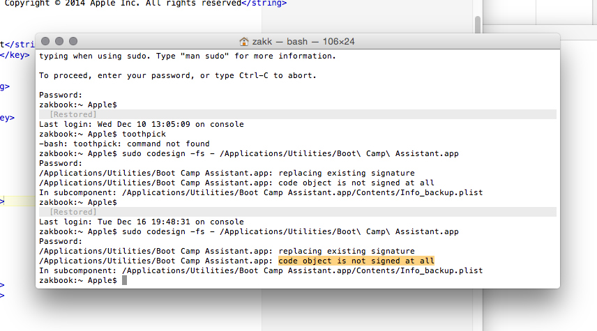 sudo codesign -fs - /Applications/Utilities/Boot\ Camp\ Assistant.app