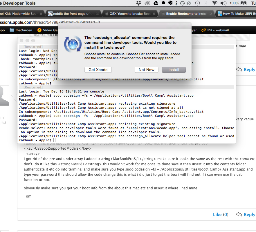 yes you need to install that first once installed redo the sudo command also I don't think it lets you save your alterations copy the plist to your desktop alter it there save it to desktop then put it back and authenticate it and replace existing then do the sudo command i just did this to make sure i have everything i told you correctly to a 2012 iMac i deleted some info in the plist and put it back and of corse without the sudo it crashed i then copied and pasted exactly what i typed and it allowed boot camp to work i know for a fact you need to download what it said cause i had to do that to my 2011 mbp