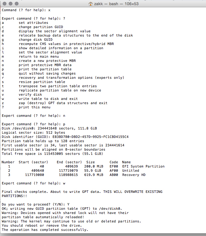 Did the gdisk stuff done in terminal have any effect on this success?