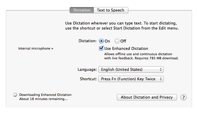 I think that I first tried downloading Enhanced Dictation right after installing Mavericks when my Mac was slowed down by Spotlight reindexing, and had to cancel the download.