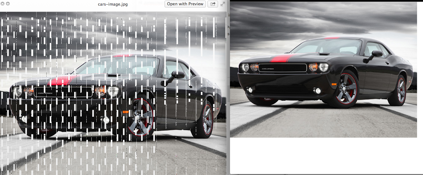 If i try and open any image file with Quick Look, Preview or IPhoto then I get the same white lines/blocks running through my pictures. But If i open the images with Safari,Chrome or a couple of others programs then the images are fine. If you resize the image by dragging the window, then sometimes the lines go, or there are less of them.