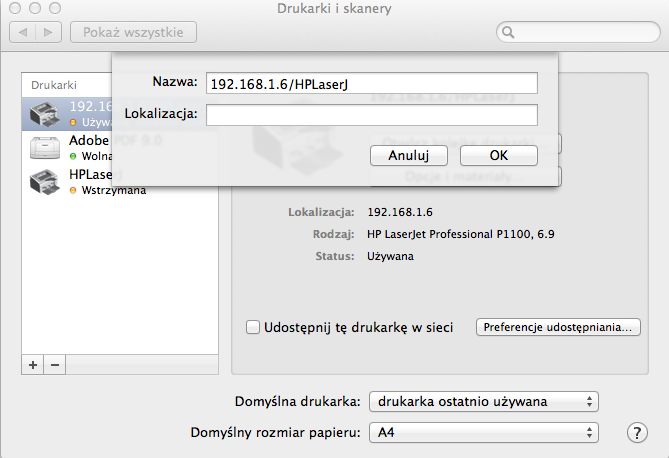 (c) ADD Printer - Choose IP - Choose Line Printer Daemon LPD - Adress is the IP address of the XP PC (not your printer) - Queue is the XP SHARE NAME of your PRINTER - Name is what you want it to show up as in your Mac printer list - Location is the XP SHARE NAME of your PC - Use is the PPD file for the printer (located at: library/printers/ppds/contents/resources/en.lproj folder on my Mac HD)