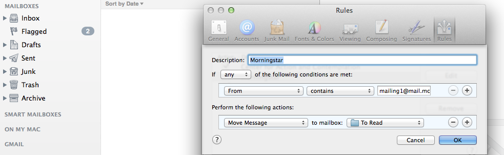 I don't have anything I use under "On My Mac". All my mail comes in under its corresponing account under "Inbox" and I've just been dragging and dropping w/o rules (to my Gmail folders). I've recently switched to Mail but have used "rules" and "folders" in other programs. I'll check out those threads you listed. Oh and I have my accounts set up using IMAP, not POP. If you have any other suggestions I appreciate it! Thank you!