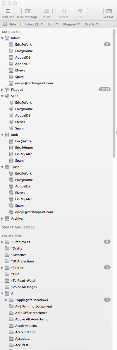 Here's something to consider from an organizational standpoint, texncali. This has worked very well for me for years... As you might imagine, there are Mailboxes "A-Z". You're just seeing a small portion of the folders. So, I've got a visual of new mail that lands in the inbox (e.g. 3 unread in this case). Many messages get sent to their folders and are also marked as read. I do this so I don't even look at them in most cases unless I'm going for latest news, ads, or whatever. If I don't want to miss anything in a particular folder, I don't mark them as read by default. This works very well where I follow a number of forums that generate hundreds of emails per day. They get put into their respective folders and I review/act on them when I get time. In the meantime, I've got a visual that they're still out there.
