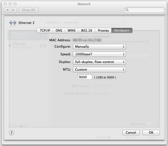 My mid-2011 Mac mini (not server) presents an Ethernet MTU choice of Standard (1500), Jumbo (9000), and Custom MTU settings in OS X 10.9.1. Keyword Ethernet. You won't have Jumbo frames option with Wi-Fi or Thunderbolt Bridge selected.