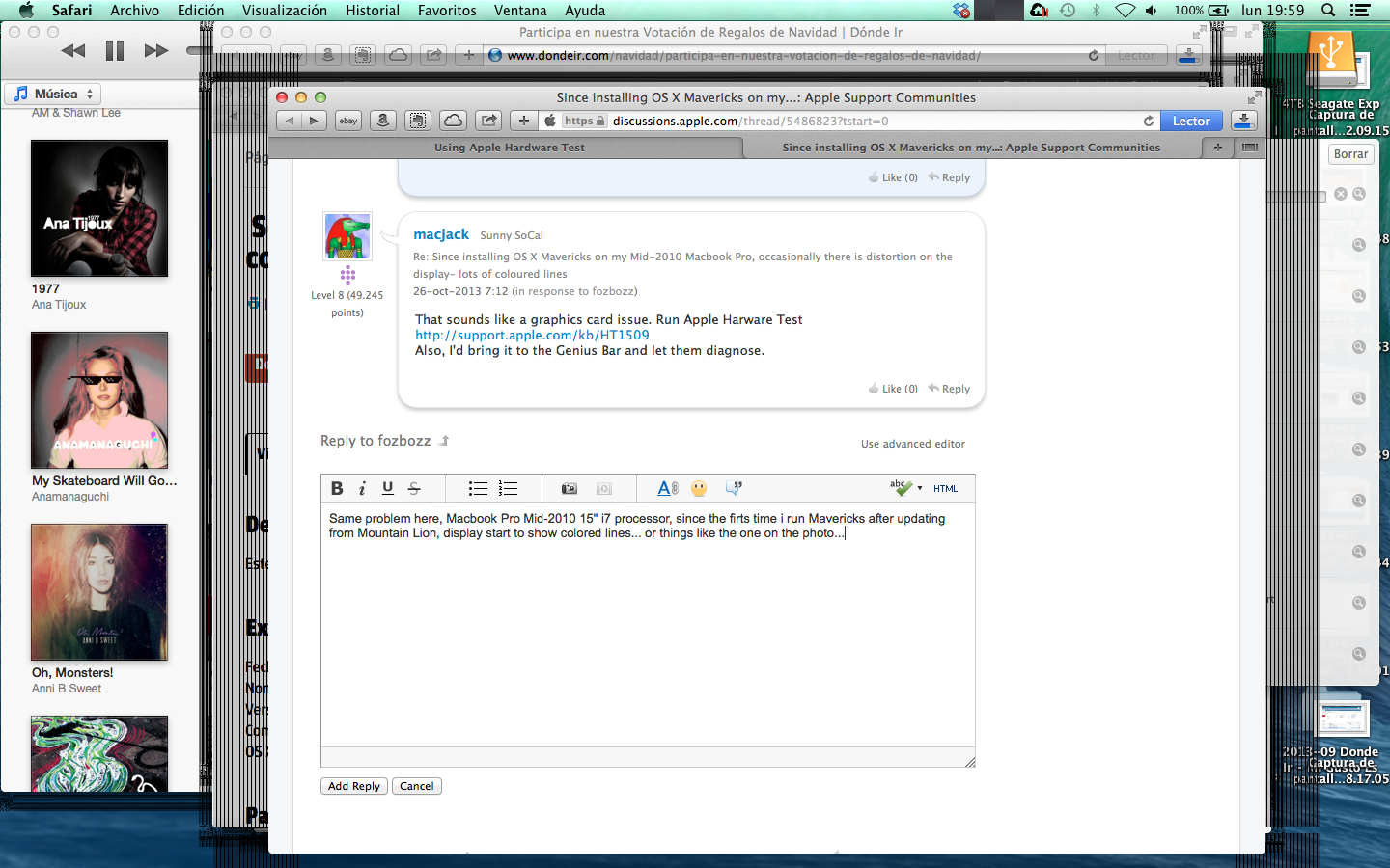 Since installing OS X Mavericks on my Mid-2010 Macbook Pro, occasionally there is distortion on the display- lots of coloured lines