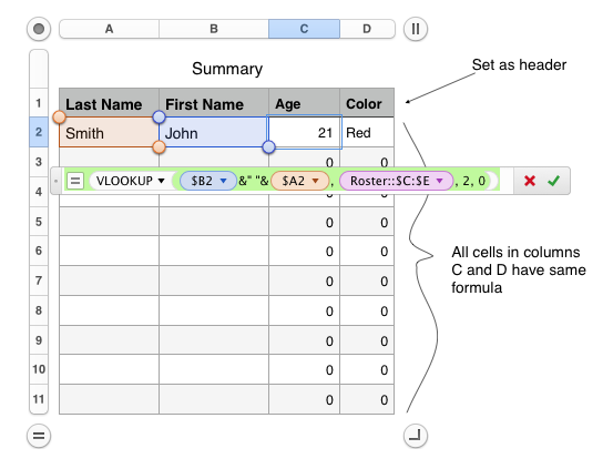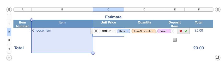 1. Lookup table 1 with header and footer and cell B4 as the sum of column B. Column A cells are pop up cells with a list of items.