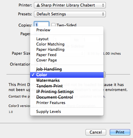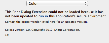 We have a 2610N and the driver disabled many functions but it still prints even from Adobe Acrobat Pro and Pages both old and new versions. Now I remember there were two drivers provided by Sharp. One was a CUPS driver I believe and the other was a PostcScript PPD profile, I don't remember which I installed. One thing is for sure many printer options cannot be run from mavericks without an updated driver. I just noticed that, older non-sandboxed apps can run all options of the driver. Seems like you're right only the newer apps. In my case however even the newer apps can still print, they just cant change most options, like watermarks, color settings etc. Fortunately the printer options, like stapling and output tray selection still work from everywhere.