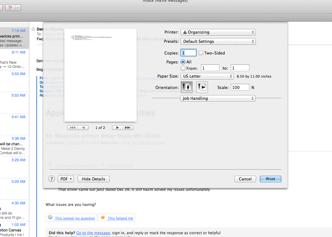 I upgraded to Mavericks yesterday and discovered that the printer driver I had been using with the Sharp MX-2640n in our office was not compatable with 10.9. I've searched Sharp's website and tried Apple's update but no luck finding something that works. I'm open for any suggestions to get me going.