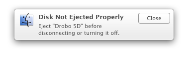 Yes my Drobo is directly connected to my Mac Mini via Thunderbolt. The problem for me only happens when waking from sleep. When I wake from sleep I get the " Disk Not Ejected Properly" message.The drive does wake and is mounted on the desktop after sleep. It actually seem to to be ejected although I keep getting that message.