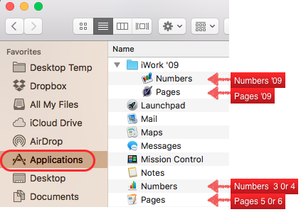 On my Dock I have icons for Numbers '09, Numbers 4, Pages '09, Pages 6