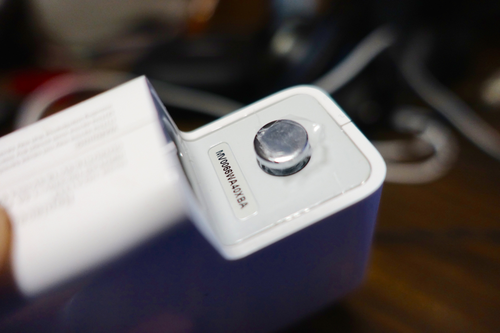 Then I inspected the adapter again. When you take off the prong attachment there is a metal rod that holds it in place (see picture). It's hard to see with the naked eye, but upon further inspection and feeling with my finger, I noticed it didn't feel quite metal. That's when I noticed there was a thin plastic film covering it.