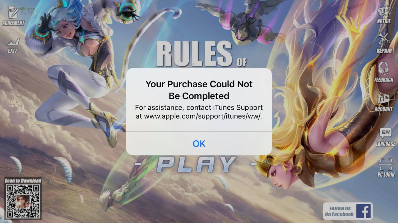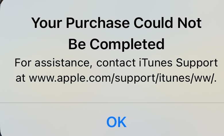 'Your purchase can not be completed. For assistance contact iTunes Support at www.app.com/support/ww.