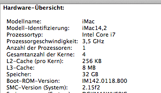 Model: iMac14,2, BootROM IM142.0118.B00, 4 processors, Intel Core i7, 3.5 GHz, 16 GB, SMC 2.15f2