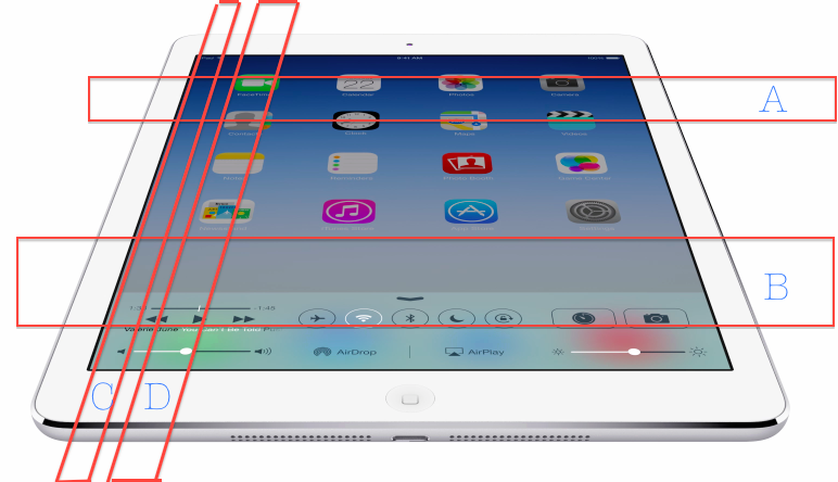 Got iPad Air on Nov.1 and found some serious display issue. As shown below, Area A, B, D seemed to be darker than other areas. This problem was so obvious that the apple store staff replaced it with another new ipad immediately. But the problem remains. Area A and B was less obvious this time but Area C was brighter (backlight is there. this situation happened a lot on cellphone screens like NOKIA ones back in 2006!!!) while Area D was darker.