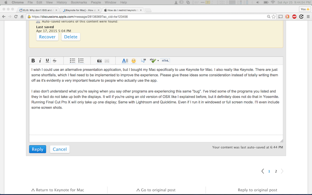 Apple needs to "sort this out". That means make it do what we need. I need to record my keynote WITH ANIMATIONS in Screenflow as I talk about the slides and interact with them. We don't care if Keynote WANTS to take over all the screens, we're telling you and the programmer with a billion dollars in cash sitting in the bank, to please fix Keynote so it allows this. I may be aware of what you've done with the program, but we don't like it. And THIS IS THE PLACE, not SOME OTHER PLACE to express this concern.