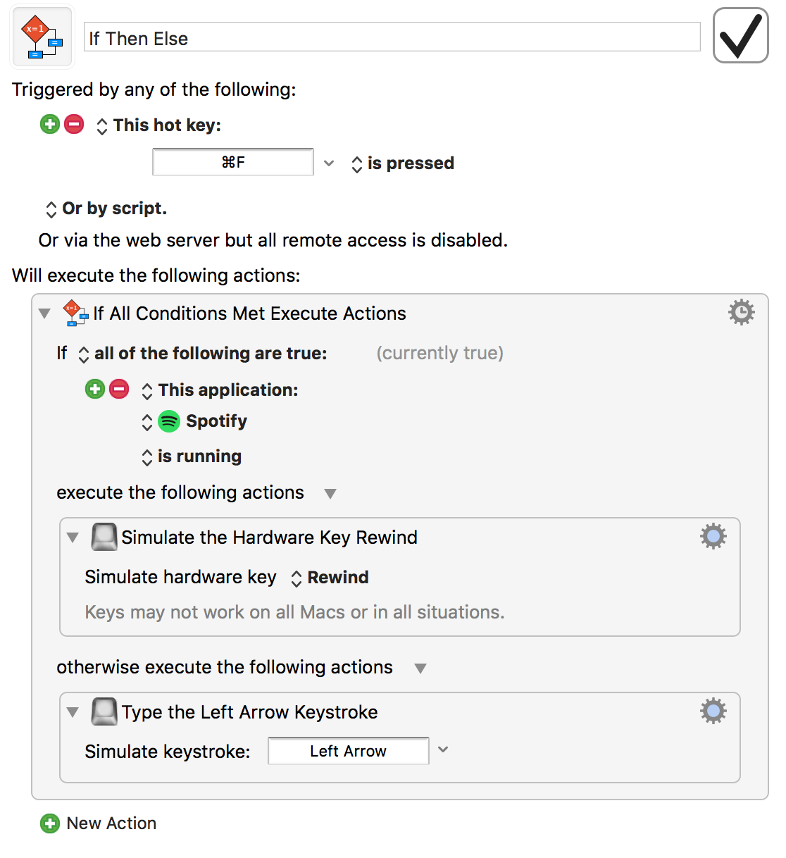 For example, the following sets a key to go back on a song if spotify is open, but otherwise it acts as the left arrow key.