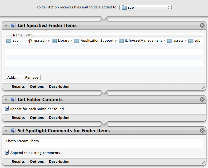 In the last action, "Set Spotlight Comments for Finder Items", add a unique comment. I used "Photo Stream Photo", but I'm pretty sure any text will work.