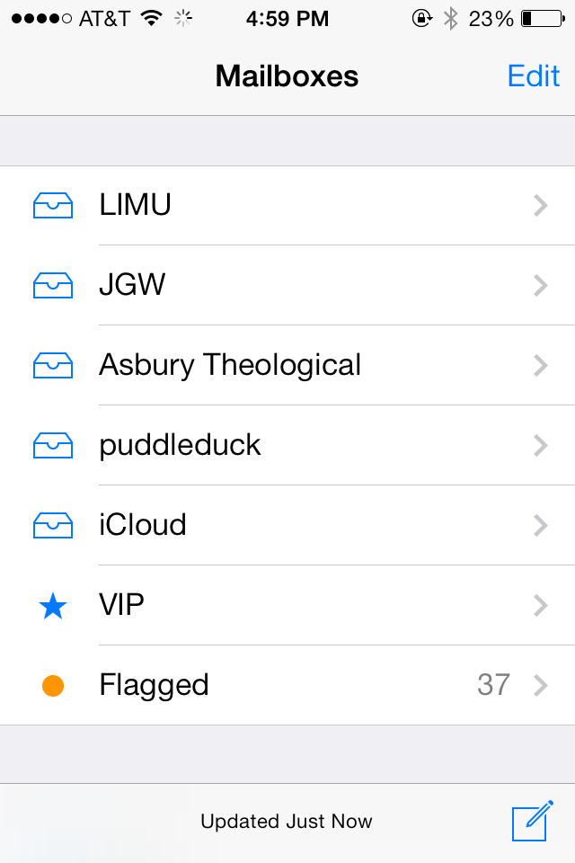 Something really annoying has happened since i updated to ios7. I can no longer see all the messages from my 6 accounts merged into into one mailbox. Instead, I have to go to each different inbox to see the messages, whereas before there was an option to see 'all messages' or 'all mailboxes.