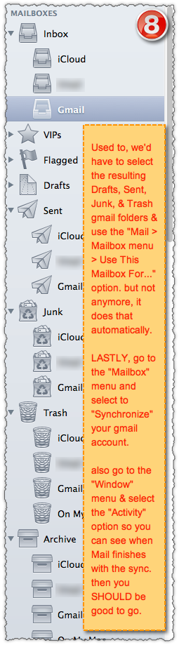 but aside from that last issue, the below procedure has brought back my Mail.app program to use Gmail as "I" believe it normally should work, and has always worked pre-Mavericks.