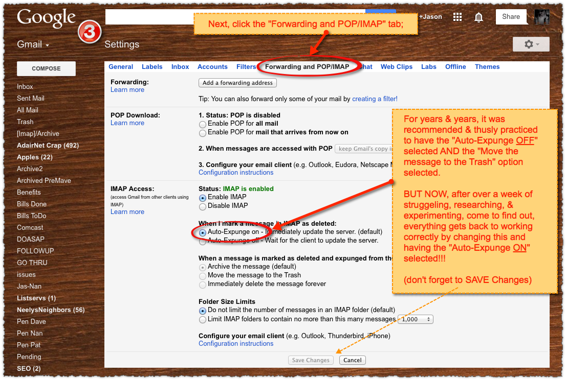 - Only the Inbox, Sent, Drafts, Spam, & Trash System Labels CHECKED to "Show in IMAP"