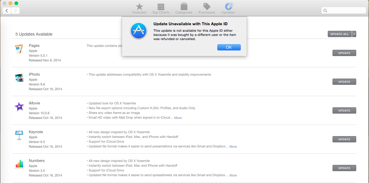Really, if you're dealing with Apple products, the only way to resolve it seems to be to call. It seems like whatever hook they use to drag their products into App Store licensing in a way that Yosemite can understand is not functioning perfectly. If none of the other solutions worked, call! it worked for me.