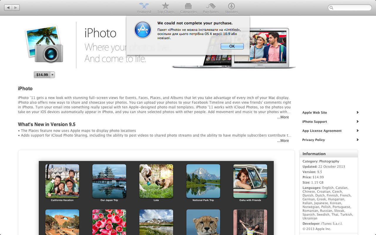 I bought iPhoto in App Store 03.11.12 for Mountain Lion. When I changet a country in my Apple ID all my previous purchases disappeared from list. Couple of weeks ago I upgraded my OS X to Mavericks and of course I upgraded iPhoto too. But Mavericks works much worse on my Mac, maybe model of my Mac is too old. So I decided to downgraded it back to Mountain Lion. But when I want to install iPhoto again it jump out a sign that I can't install it because my OS X is too old and I need OS X Mavericks. What need I do to install iPhoto on my Mac?