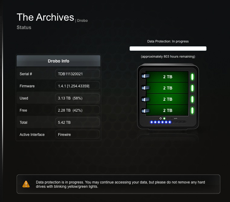 4. I ended up copying all of my data to my Synology and was going to keep the Drobo as a backup. I then removed one of my Drives out to put into my Synology. I only have 3TB of actual data on my Drobo so thought the Data Protection process would be pretty quick. It has been running for 24 hours and claims it will take another 426 hours to complete!