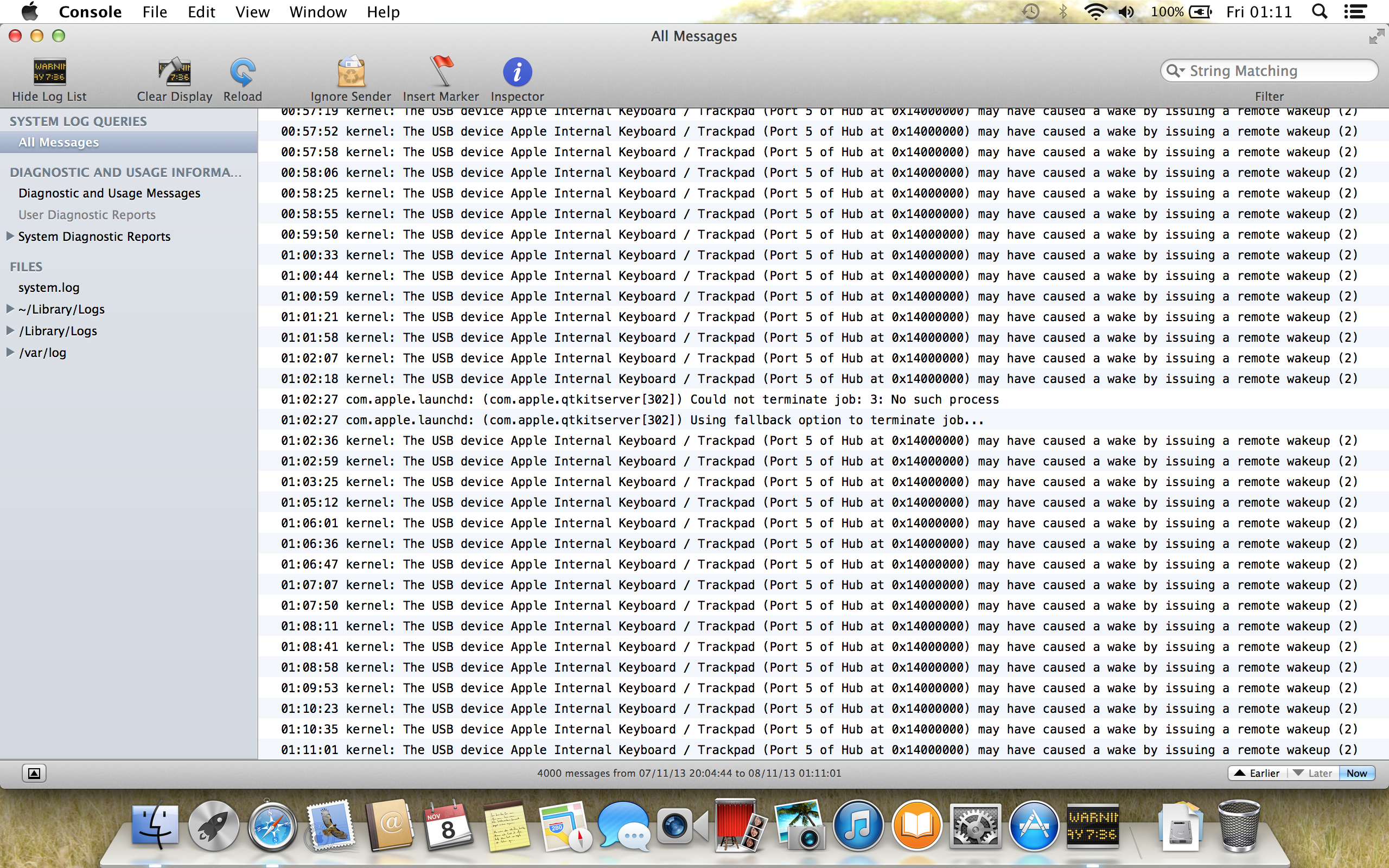 08/11/13 00:49:01,000 kernel[0]: The USB device Apple Internal Keyboard / Trackpad (Port 5 of Hub at 0x14000000) may have caused a wake by issuing a remote wakeup (2)