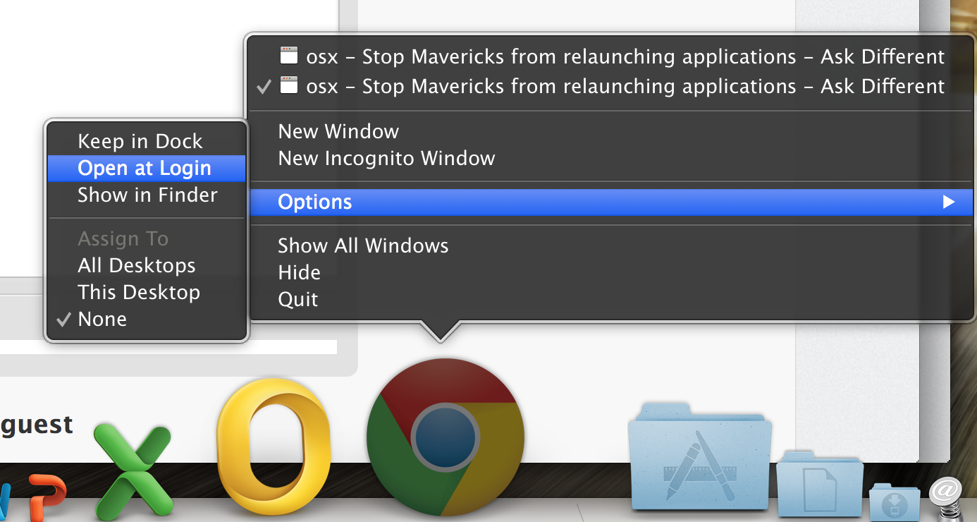 To investigate coordination between the list of Login Items and the Open at Login option in the Dock, I conducted 2 tests.