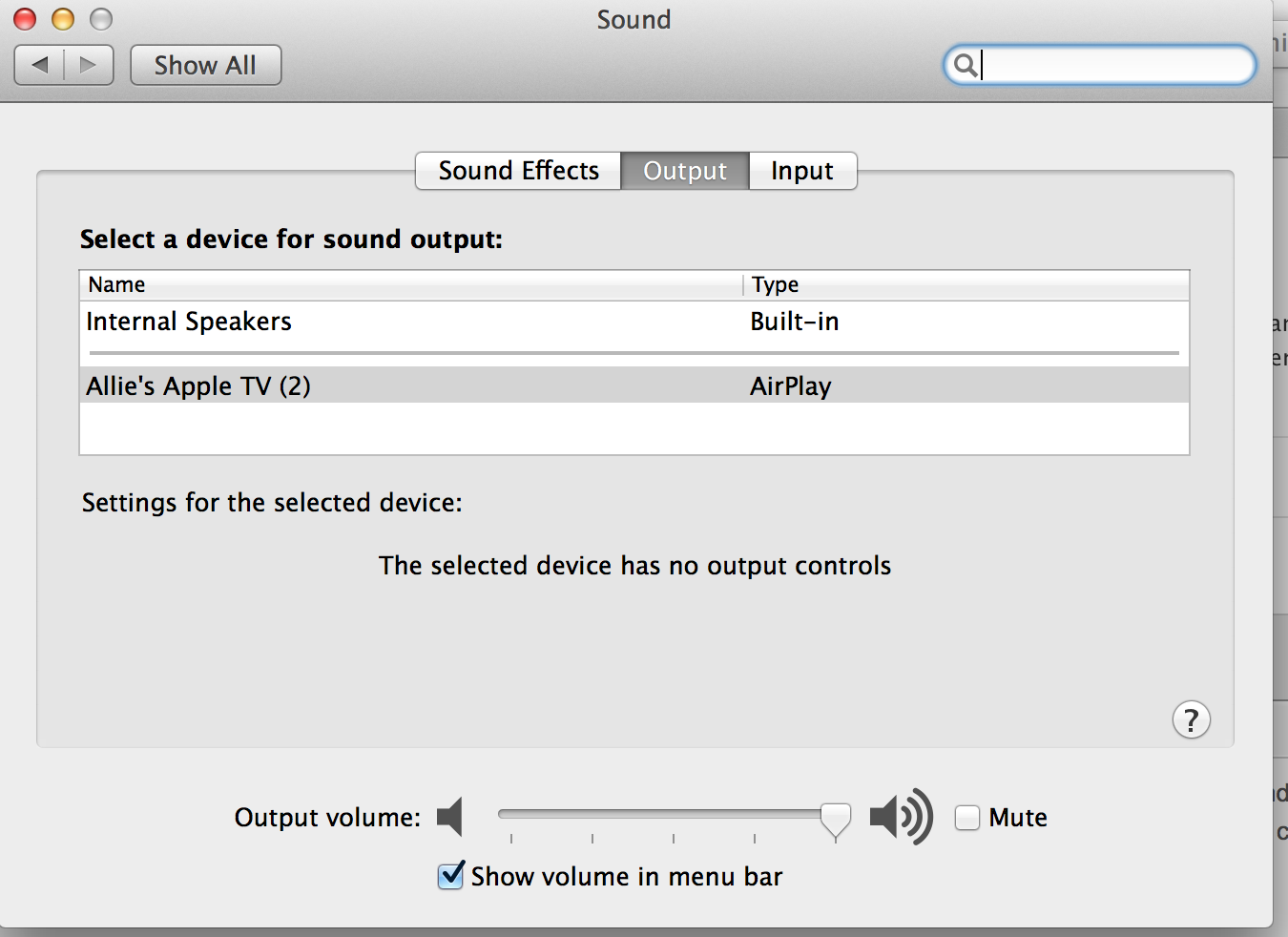 When I extend my desktop from my MacBook Pro 15" mid-2012 model to my tv connected via Apple TV, I can move windows to and from either screen no problem, but I cannot get sound to play through the speakers on my tv for some reason. I've tried going into system preferences and manually changing the sound output device from the computer's speakers to the Apple TV, but it will not allow me to select the Apple TV. I'm sure I'm not the only one who has had this issue. Has anyone ben able to resolve this?