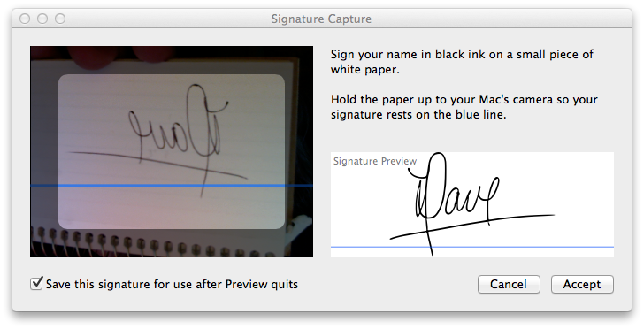When I go to add a signature in Preview, I hold the signature up to the camera and nothing happens. I've seen videos of people doing the same thing and Preview instantaneously shows a preview of their signature. I do not have the same luck. Pressing Accept just closes the window and doesn't add a signature. I'm unsure what to do now, as I need to add a signature to a PDF document and would rather not take a picture of the screenshot and paste it into the original Word document.