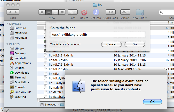 Here is how I am getting the permission message.....Finder, then Go to Folder. Cut and paste /usr/lib/libgenkit.dylib and as soon as I press "Go" in the grey Go to the Folder box it says "The folder can't be found" and almost simultaneously a second box pops up with the Finder icon (blue face?) that says "The folder “libgenkit.dylib” can’t be opened because you don’t have permission to see its contents." I then have to click on "OK". Am I doing something wrong or is there another issue?