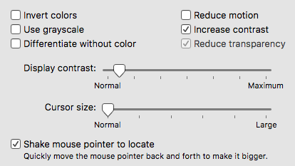 Update on my previous post Having concluded that this is not a hardware problem I too installed the TG pro software and set the fan to 10%. I also went into system Preferences and turned off energy saver also turned off screen saver. My screen is set at 100% brightness and I haven't changed it what I did do is go into accessibility and changed the settings there as displayed below. Now this hasn't fixed it completely but it is far more stables ie I'm getting around 6 hrs usage before it goes black to bring it back up again I just fiddle with the display settings and then reset to what's shown below. Not the ideal solution I know but at least I can get my work done ( Thank goodness for the second screen) I have noticed a few other odd things with this problem such as I don't always get asked for my password when I log in it just goes straight to my desktop. setting the Mac not to change the background image is ignored the image still changes. I lost all the extra desktops I setup. although I have upgraded to the latest OS I'm seriously considering wiping the drive and doing a completely fresh install. The main problem with such a drastic measure is the time it will take.