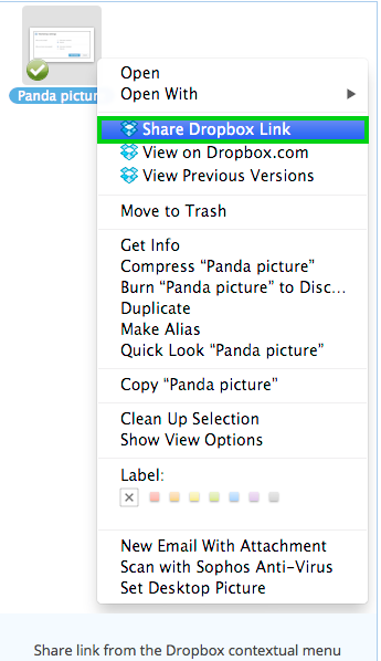 If you have the Dropbox desktop application on your computer, simply control-click (or right-click) on the file to open its contextual menu. Choose Share Dropbox link. The link will be copied and you can immediately paste it anywhere.