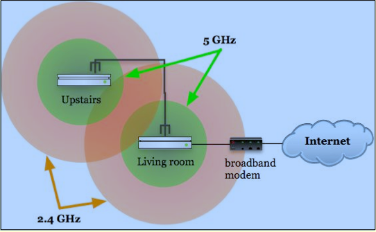 To get an idea on how a simultaneous dual-band router can extend both bands at the same time please take a glance at the following image. Note that both base stations must be within range for both bands to extend both. In the image only the 2.4 GHz band would be extended. However there would still be network connectivity.
