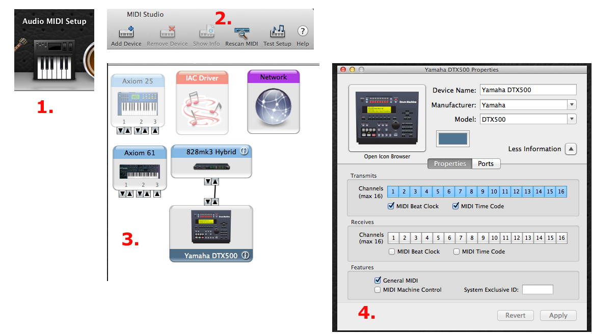 In the examples shown below I have a Yamaha Electronic Drum Kit that is Midi Out only... not USB out. I had to plug a Midi cable from the Midi Out Port on the back of my Drum Module to the Midi In Port on the back of my Motu 828 Audio Inferface which is connected to my Mac. Next I created the Audio Interface and Drum Module "Devices" as mentioned above.