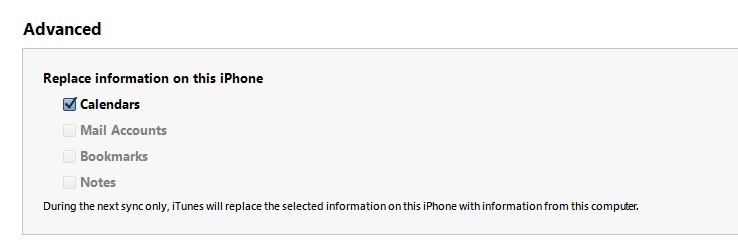4. In iTunes (with your phone recognized by iTunes), click on your iPhone tab (upper right); then click on the Info tab, and check “Sync Contacts with Outlook”, check “All Contacts”, and check “Sync Calendars with Outlook”, pick “All Calendars”. Under “Advanced”, if you want a two-way initial sync (items deleted from Outlook, but not from your iPhone, will come back into Outlook, and vice-versa), then don’t check anything. If you want to start with Outlook being the master data file, then under “Replace information on this iPhone”, check the appropriate boxes, and the Outlook data will overwrite the iPhone on the initial sync. You don't need to check these boxes again, and you will have an accurate 2-way sync.