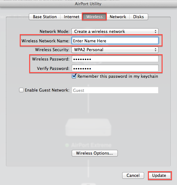 Click on the "Update" button at the bottom of the window to save the settings and change your AirPort password.